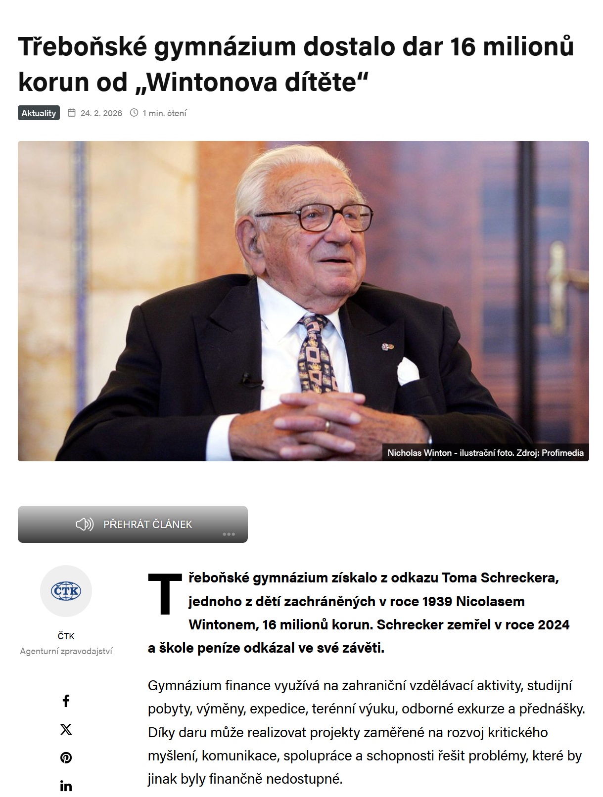 Dar pro gymnázium očima dalších médií