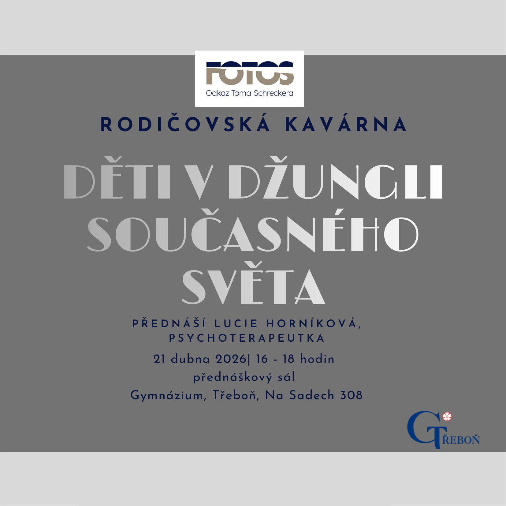 srdečně Vás zveme na druhou Rodičovskou kavárnu na téma Děti v džungli současného světa, kterou pro Vás pořádáme díky finanční podpoře FOTOSu. Otevřeme citlivá a často obtížná témata dnešní doby. Setkání povede zkušená psychoterapeutka Lucie Horníková, která nabídne odborný pohled i prostor pro sdílení. Společně se dotkneme problémů, se kterými se děti a dospívající stále častěji potýkají – poruchy příjmu potravy, sebepoškozování, nadměrné hraní her, šikana. Cílem setkání je vytvořit bezpečné a respektující prostředí, kde můžete sdílet své zkušenosti, klást otázky a hledat cesty, jak své děti lépe podpořit a porozumět jim.