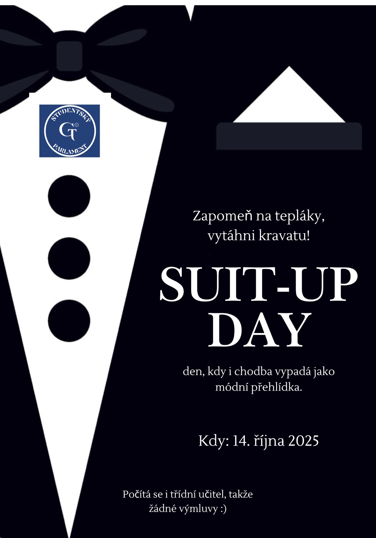 Studentský parlament Gymnázia Třeboň odstartuje letošní ročník Školního poháru stylově! První akcí bude tradiční Suit Up Day, během kterého se naše chodby zaplní elegantními saky, košilemi, kravatami, motýlky i šaty.
