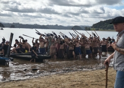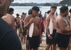 V pátek však další školní den nenastal, byl totiž státní svátek Waitangi day, oslava podepsání Treaty of Waitangi 6. února 1840 mezi maorskými náčelníky a Brity a která určila, že Zéland bude pod křídly Spojeného království. Během tohoto dne se tak do Waitangi - malé vesnice u moře sjede až několik desítek tisíc lidí (letos přes 35000). Už od brzkého rána (jakože od 4 ráno) se zde konají různé akce, takže jsem tam rozhodně nemohl chybět a to obvzláště když se samotné Waitangi nachází shodou okolností pouhých 5 km od Haruru, kde bydlím. Kdo mě ale zná, tak ví, že ve 4 ráno by mě nic z postele nezvedlo, a tak jsem vyrazil z domu až krátce po 7 a šel jsem zhruba kilometr na shutle bus, který svážel lidi parkující všude na loukách a polích v okolí do Waitangi a zpět. Naštěstí jsem vyšel ve správný čas, a tak jsem těsně stihnul zrovna odjíždějící bus. Cesta netrvala dlouho a za pár minut jsem byl už na pláži ve Waitangi. Hned co jsem vystoupil z autobusu, tak mě překvapilo, kolik tam je vlastně lidí - celá půlkilometrová pláž a přilehlá slilnice byla plná lidí a nebyli tam náhodou. V půl deváté ráno totiž začínala rekreace příjezdu maorských kmenů na lodích na pláž. Mě se naštěstí podařilo sehnat místo hned metr od pláže a jen 20 m od samotného středu příjezdního místa, kde čekala historická vítací delegace. Mohl jsem tak vidět z bezprostřední blízkosti nejdříve vábení lodí pomocí troubení na obrovské lastury a po chvíli i příjezd lodí. Ty jedna po druhé začaly proplouvat z vnitrozemí pod mostem a za zvuků takt udavajícího bouchaní oštěpu o dno lodi se začaly více a více přiblizovat samotné plaži. Tyto maorské lodě přezdivane waka jsou svým typem velmi podobné dračím lodím. Každá byla zhruba 20 m na délku a az 2 metry na šířku a vezla až 50 lidí. Tyto lodě jsou většinou vyřezavany z jednoho kmenu stromu a mají na sobě nádherne pro každou loď specifické vyřezané ornamenty a sošky. Postupně se začaly tyto lodě blížit více a více a netrvalo dlouho a první z nich zakotvily najetím na mělčinu pláže. Zpod mostu však vyplouvaly další a další lodě, takže nakonec se na pláži objevilo kolem celé dvacítky maorských waka lodí. Následně z každé lodě vystoupil náčelník a šel se setkat s delegací. Poté z pár lodí vystoupili i samotní členové kmenů a v kruhu předvedli něco jako bojový tanec, aby ukázali svou sílu vítací delegaci. Nakonec pak vystoupilo na pláž všech 700 maorů, nastoupili všichni vedle sebe a pak provedli fascinující, avšak velmi děsivě vypadající bojový tanec se zpěvem. Bylo to úžasné, ale zároveň jsem se jich skoro až bál, jak jsem byl jen ani ne 2 m od nich a z jejich tváří sršela zuřivost síla a připravenost na boj. Poté však delegace zřejmě dospěla k úspěšné dohodě, a tak válečníci naslákali zpět do svých lodí a začli postupně s přicházejícím odlivem odjíždet zpět do vnitrozemí.