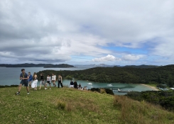 Druhý den pak byl hned výletový, jelikož pro všechny mezinárodní studenty uspořádala škola trip na lodi z Paihie až k slavné skalní bráně nad mořem na jednom ostrůvku u poloostrovu Brett. Plavba tam trvala asi 2h, ale nudná rozhodně nebyla. Nejen že byly totiž krásné výhledy na desítky menších a větších ostrůvků a poloostrovů v Bay of Islands, ale zároveň se k nám několikrát přidali i hejna delfínů, jež pluli s lodí a skákali do vzduchu. Samotná slavná skalní brána pojmenovaná originálně Hole in the rock pak byla vskutku impozantní. V nejvyšším bodě měla zhruba 17m, na šířku 15m a na délku přes 30m. Byla teda tak velká že za klidného moře skrz ní dokonce tyto výletní lodě proplouvají. Bohužel v náš den bylo moře celkem rozbouřené a tak jsme se na ni mohli dívat jen ze vzdálenosti 20m.Cestou zpátky, když jsme jeli přímo proti vlnám a větru tak se pak prověřila odolnost vůči nausee u nejednoho pasažéra jelikož se naše loď celkem brutálně kymácela. Já naštěstí již vytrénovaný ZeroG letem jsem to ustál bez problému. Po zajetí do krytu zátoky jsme pak vystoupili na jednom soukromém ostrůvku, kde jsme měli zhruba 2h volného času. Vyrazili jsme tak na jeden z vrcholů tohoto ostrova odkud celá Bay of Island připomínala spíše Filipíny než Nový Zéland. Byl to vskutku nádherný výhled. Cestou zpět jsme i potkali stádo ovcí, co na ostrově žijí, a za pár minut jsme se už koupali v moři. To teda nebylo teplé, jak bývá ve středomoří v létě, ale stále bylo více než příjemné. Tento den se však také začínal projevovat můj příliš dlouhý pobyt na slunci během chození po Jižním ostrově, jelikož se moje kůže na rukách a krku začala loupat jak hadovi.