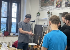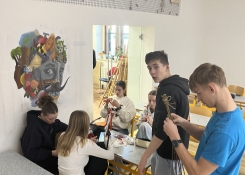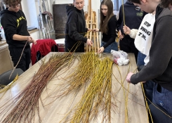 Do pletení pomlázek pro Charitu Třeboň se  zapojili studenti kvinty v hodinách výtvarné výchovy spolu se svým učitelem Vilémem Roženským.